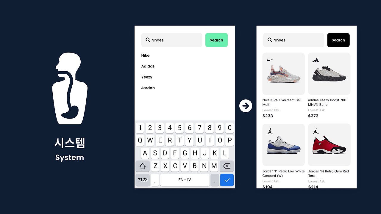 여러 신체 기관을 이용해 기능을 수행하는 것을 시스템이라 합니다. 프로덕트에서는 모듈과 컴포넌트를 이용해 문제를 해결하는 과정으로 패턴이라 합니다. 여러 요소를 이용해 사용자가 상호작용하고 원하는 작업을 끝마치는 과정 전체를 뜻합니다. 예를 들어 검색어를 치고 검색 결과를 보고 원하는 정보를 훑어보는 전체 과정이라고 볼 수 있습니다.