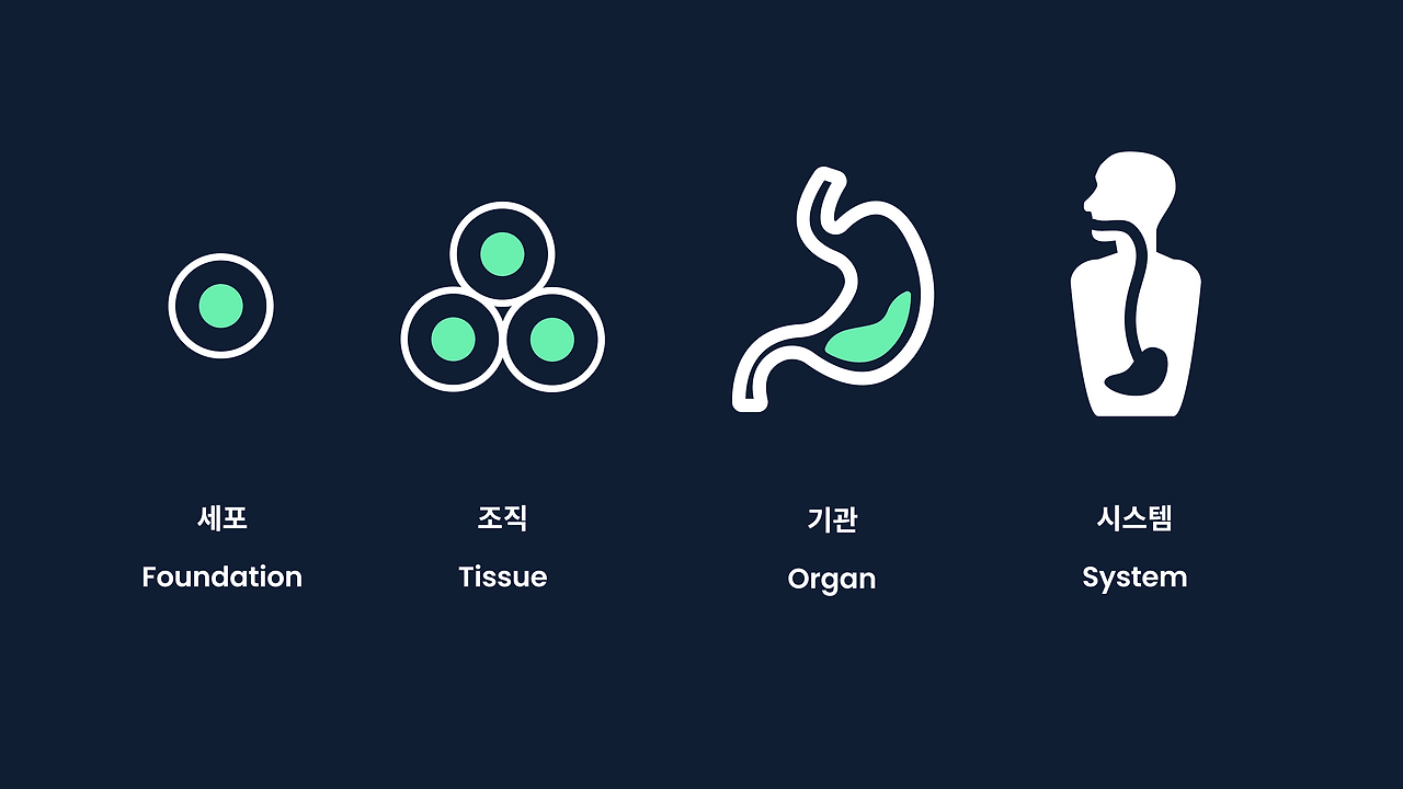 말할 줄 모르는 이 생명체가 목소리를 가질 수 있게 UX 글쓰기로 목소리를 주고, 여러 시각 요소로 숨 쉬고 움직이는 플로우, 패턴을 만드는 과정이 마치 생명체를 만드는 것 같다는 생각이 들었습니다. 아무것도 없는 0에서부터 프로덕트라는 생명체를 만들 때 우리는 디자인 시스템을 사용합니다. 가장 유명한 디자인 시스템 방법론은 아토믹 디자인(Atomic Design)이죠. 이 개념은 브래드 프로스트(Brad Frost)가 고안한 개념으로 원자-분자-템플릿-페이지로 프로덕트를 구성하는 디자인 방법론입니다. 디자인 툴인 스케치 앱과 심볼과 피그마의 컴포넌트가 훌륭하게 기능을 제공해 이 디자인 방법론이 빠르게 성장했습니다. 저는 조금 다른 관점으로 디자인 시스템을 풀어보려 합니다. 유기적이고 진화하는 생명체의 관점으로요.