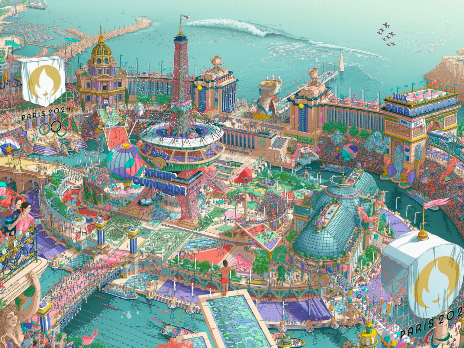 초현실적인 아르데코풍 일러스트레이션으로 파리를 세밀하게 묘사했습니다. 밀도 높은 미니어쳐 세상은 보는 것만으로도 즐거운 축제 분위기를 느낄 수 있습니다. 파리를 상징하는 공간, 대회 장소, 새로운 스포츠, 주요 인물을 모은 거대한 경기장을 그렸습니다.