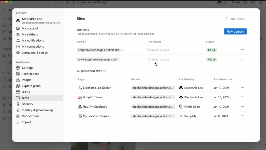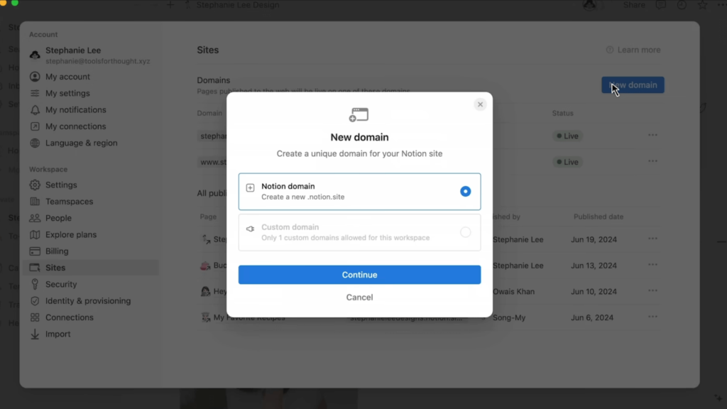 도메인 명은 노션에서 제공하는 기본형과 맞춤형을 사용할 수 있습니다. 기본 도메인은 원하는 주소를 입력하면 어미에 .notion.site가 붙습니다. 커스텀 도메인은 노션의 서드파트 서비스와 함께 사용할 수 있습니다. 한 달에 10달러입니다. 여러 도메인을 이용해 1개의 노션 내에서 블로그, 커머스 등 용도에 맞게 나눌 수 있습니다.