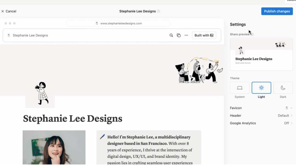 사이트를 맞춤형으로 설정할 수 있습니다. 라이트/다크 모드를 제어할 수 있고 공유 시 보여줄 미리 보기 이미지나 파비콘을 설정할 수 있습니다. 헤더의 구성 요소로 빵부스러기, 검색, 템플릿 복사를 넣을 수 있고 원하는 특정 페이지 링크를 삽입할 수 있습니다. 노션 워터마크인 Built with N은 뺄 수 없네요. 유료화의 향기가 납니다. 구글 애널리틱스 아이디를 입력해 방문자 기록을 분석할 수도 있습니다.