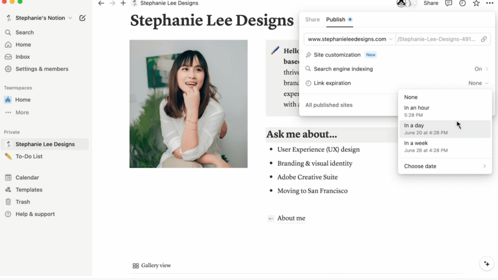 동료와 함께 작업하기 위한 URL과 공개적으로 웹을 게시하기 위한 URL은 다릅니다. 원하는 용도에 맞게 URL를 공유하면 됩니다. 기간을 설정해 제한적으로 웹을 공개할 수도 있습니다.