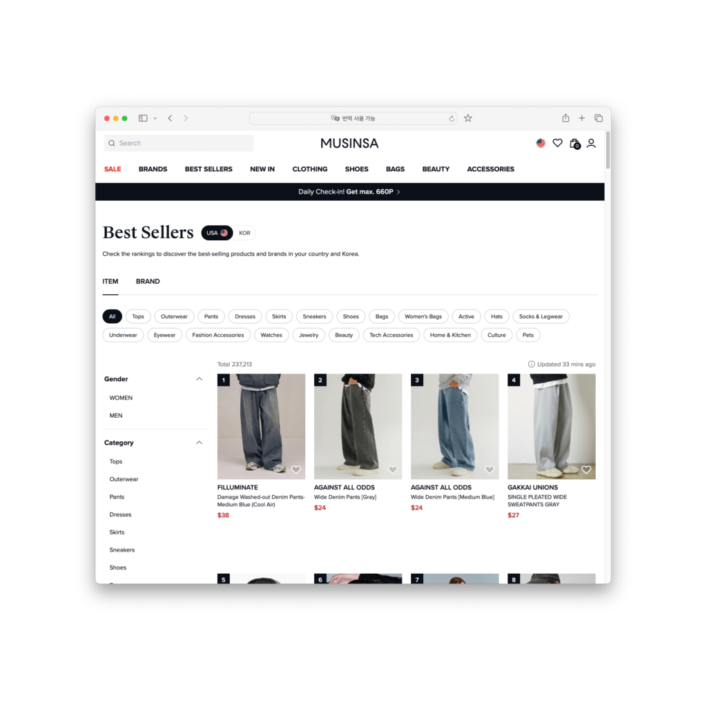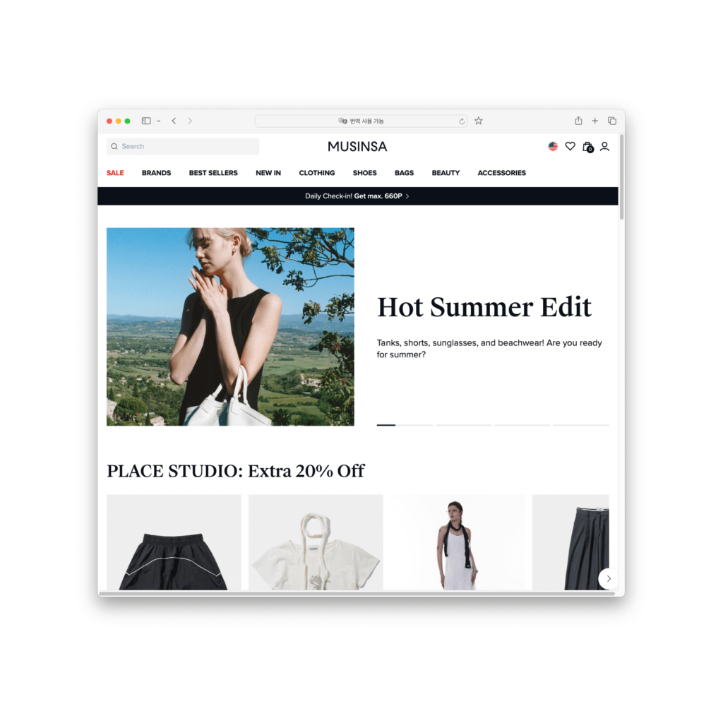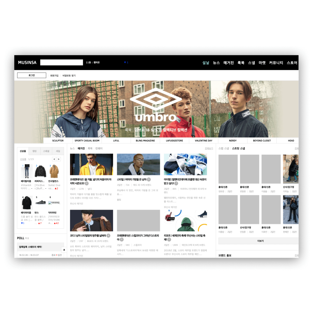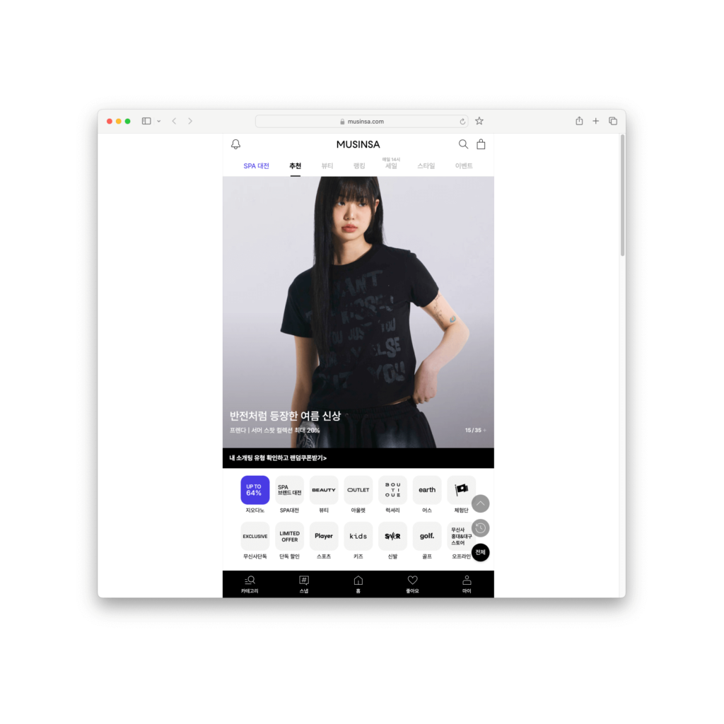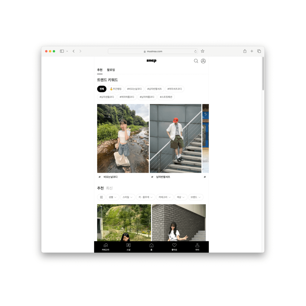 커뮤니티 커머스를 대표하는 첫 화면의 랭킹과 스냅샷이 사라지고 프로모션 배너와 퀵링크가 배치된 것이 가장 충격적이었습니다. 무신사는 이음새가 느껴지지 않는 매끄러운 경험을 위해 일원화했다고 밝혔습니다. 무신사 앱을 사용하다가 무신사 웹을 사용하는 경우에는 유용할 수 있어 보이지만 다른 웹을 사용하다가 모바일을 미러링한 웹을 사용할 때는 이음새가 크게 느껴집니다. 마우스로 클릭 하다보면 결국 모바일을 사용하게 되죠. 서비스를 여러 플랫폼에서 사용하는 것보다는 모바일 사용을 유도하는 형태입니다.