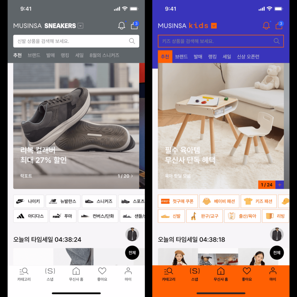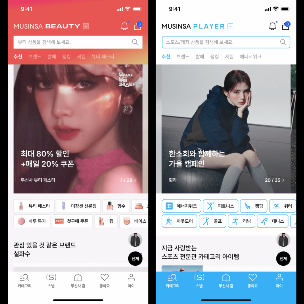 무신사가 제공하는 수많은 카테고리를 멀티 스토어 형태로 나눴습니다. 무신사, 뷰티, 플레이어, 아울렛. 부티크, 스니커즈, 키즈, 스냅으로 나뉘었습니다. 사용자가 자신이 지금 어디에 있는지 명확하게 파악할 수 있게 카테고리간 서로 다른 배색을 사용합니다. 사용자가 새로운 동작법을 학습할 필요가 없게 레이아웃, 패턴, 스타일은 동일하게 설계됐습니다. 얇은 선, 각진 꺽임은 유지됩니다.