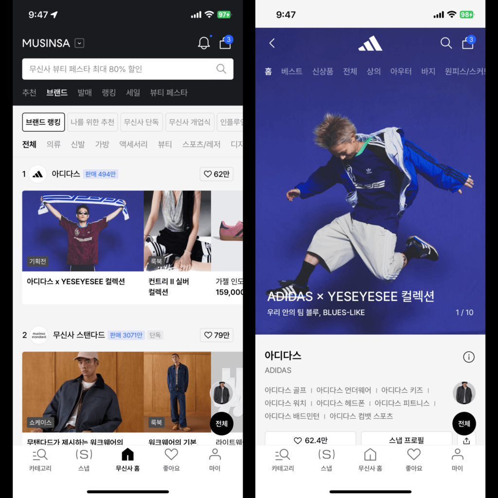 기능적으로는 무신사의 정체성이라고도 할 수 있는 브랜드 중심 경험이 매끄럽습니다. 화제가 되는 브랜드의 순위를 한눈에 확인할 수 있고 관심 있는 브랜드만 필터링해 한정 발매, 인기 상품 소식을 볼 수도 있습니다. 어떤 브랜드도 담을 수 있는 UI로 설계해 개별 브랜드 페이지는 마치 브랜드가 직접 운영하는 쇼핑몰처럼 보입니다.