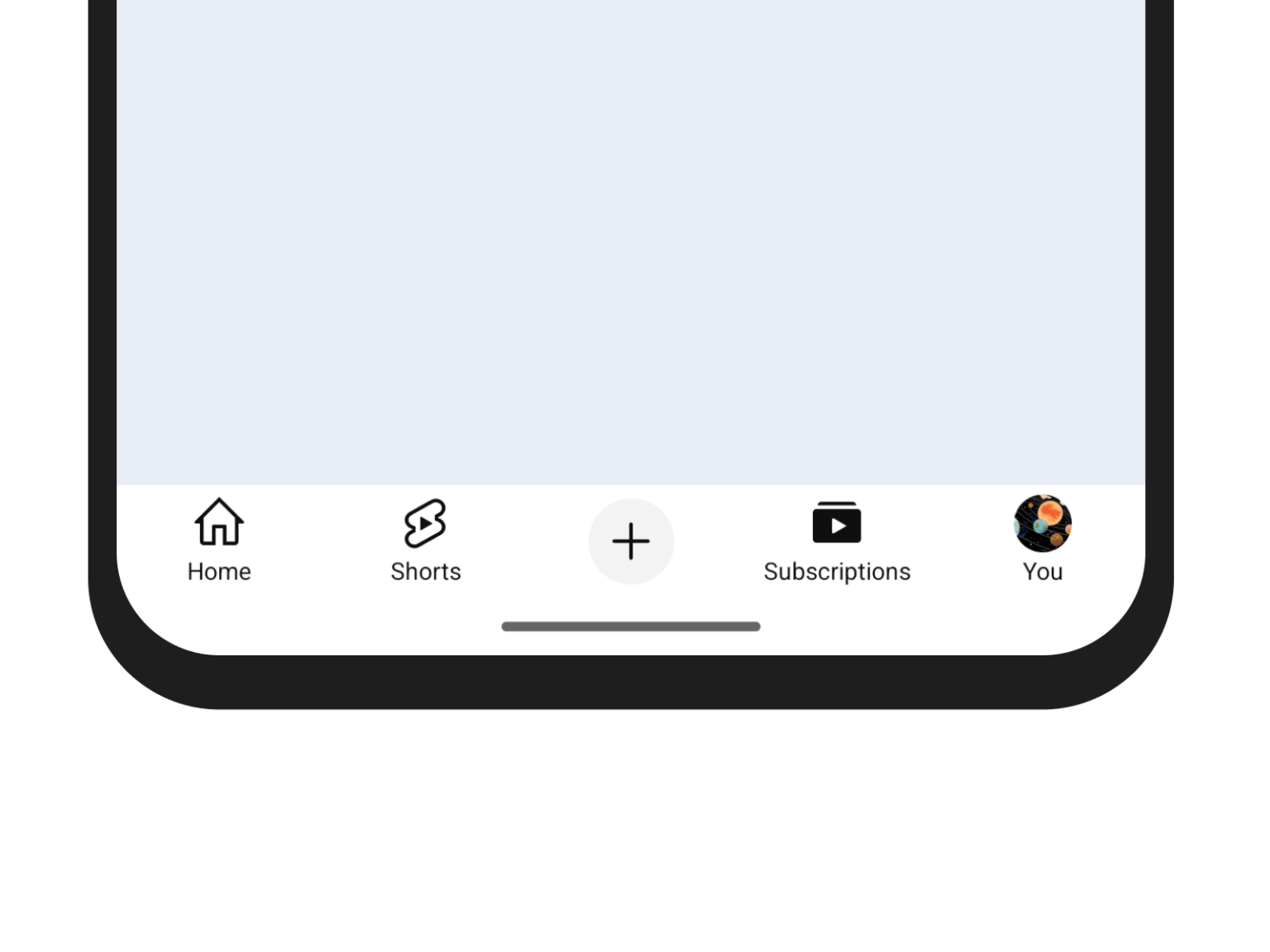 유튜브 하단 네비게이션 바 디자인이 업데이트되었습니다. 5개의 아이콘 배치 순서는 그대로이며 전체적으로 선 굵기가 굵어졌습니다. 홈은 지붕에 상세한 묘사가 추가됐습니다. 숏츠는 외곽선 굵기가 굵어졌고 내부 재생 버튼의 크기가 커졌습니다. 콘텐츠 업로드 버튼은 선이 아닌 면으로 바뀌었습니다. 십자 아이콘은 끝이 둥글어졌습니다. 구독 아이콘은 3장에서 2장으로 바뀌었고 모서리가 둥글어졌습니다. ‘You’는 변화가 없습니다.