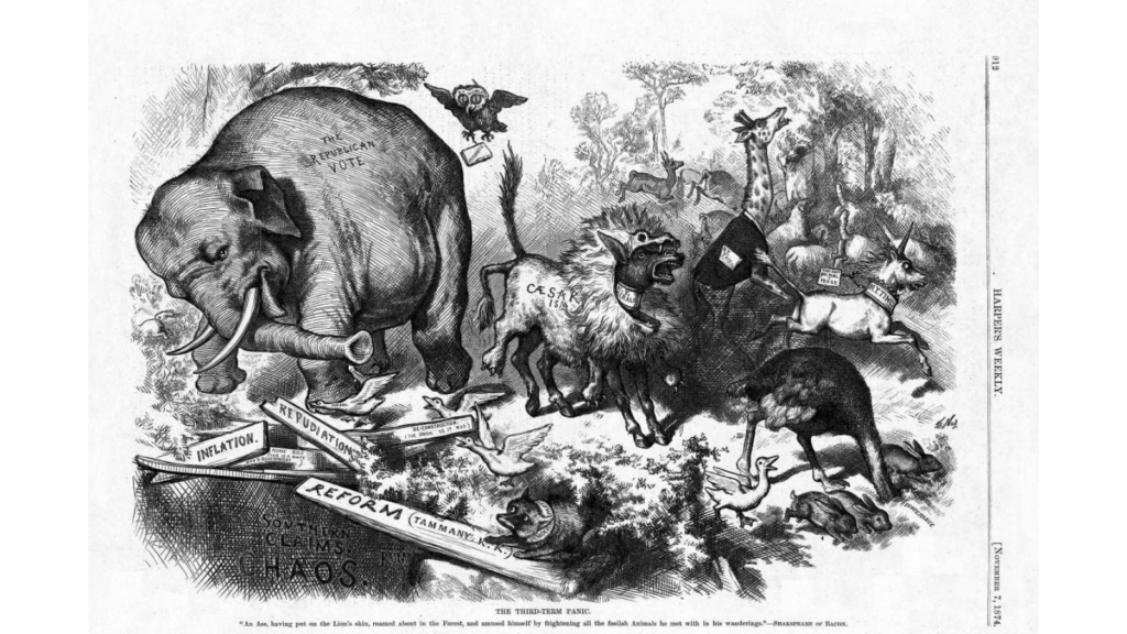 미국 공화당의 코끼리 역시 원래 상징은 아니었으나 1874년 11월 시사 만화가 토머스 내스트가 3선 도전을 고려하는 율리시스 그랜트 대통령과 이를 비판하는 민주당 성향 언론으로 인해 혼란에 빠진 공화당을 코끼리로 풍자하면서 처음 사용되었고, 이후 공화당 지지자들이 ‘코끼리는 위엄 있고 점잖으며 힘이 강한 동물’이라 강조하며 당을 대표하는 동물로 내세우면서 현재 공화당의 상징으로 자리잡았다.