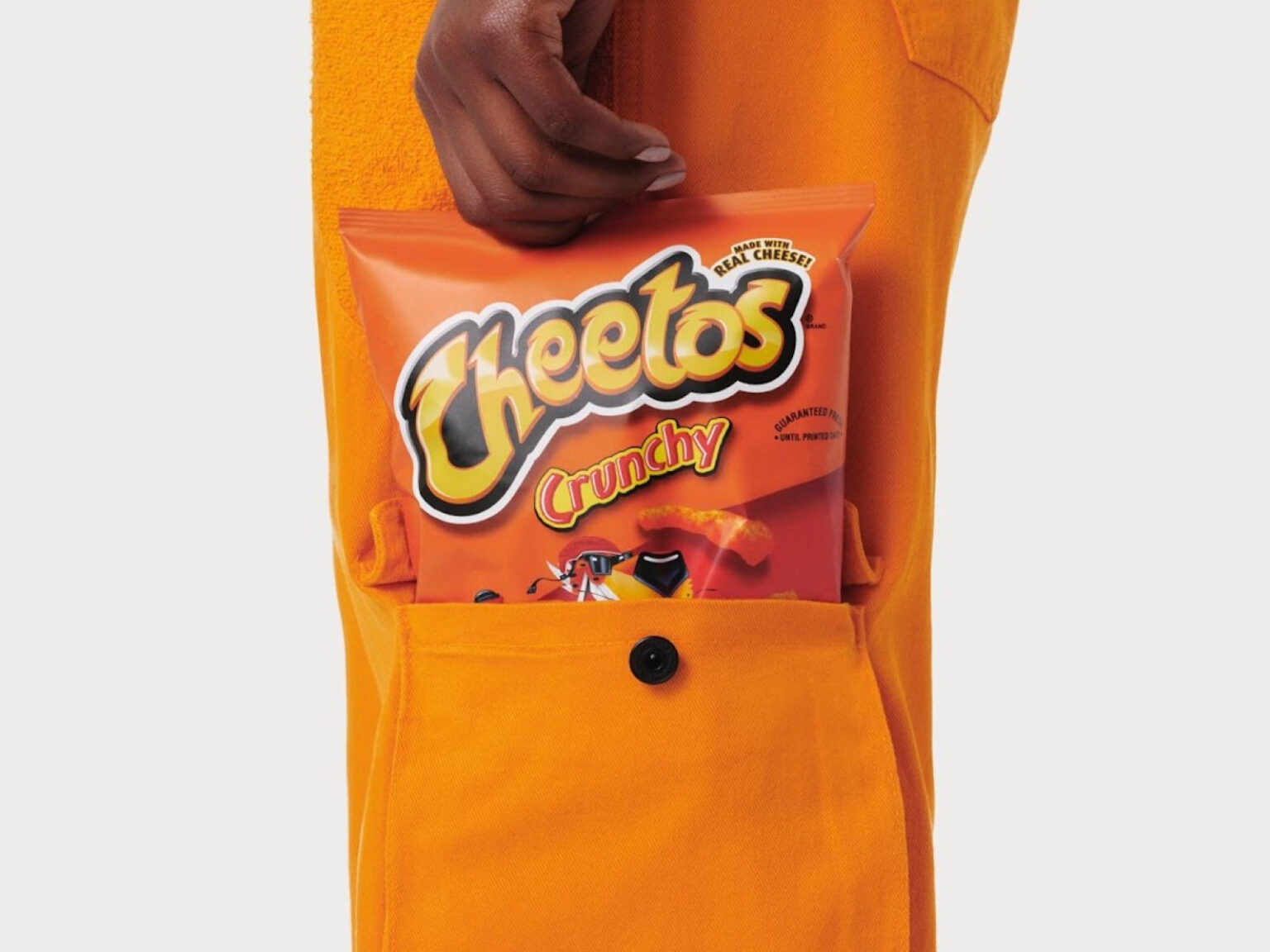 바지 주머니는 치토스 크런치 한 봉지를 딱 맞게 넣을 수 있는 크기로 제작되어 먹기 좋은 경험까지 고려한 디자인을 구현하였습니다.