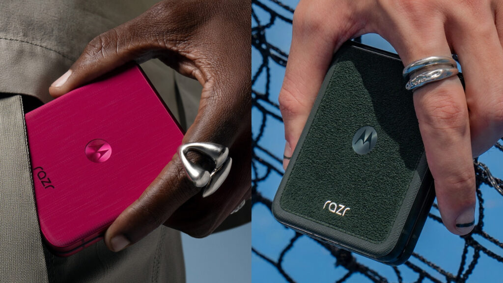 Razr Ultra의 가장 큰 특징은 외형과 감성입니다. 실제 나무 소재를 사용한 뒷면은 과거 Moto X를 연상시키며, 다크 레드 텍스처, 마젠타 컬러, 그리고 부드러운 촉감의 합성 섬유 알칸타라(Alcantara) 옵션도 함께 제공됩니다.