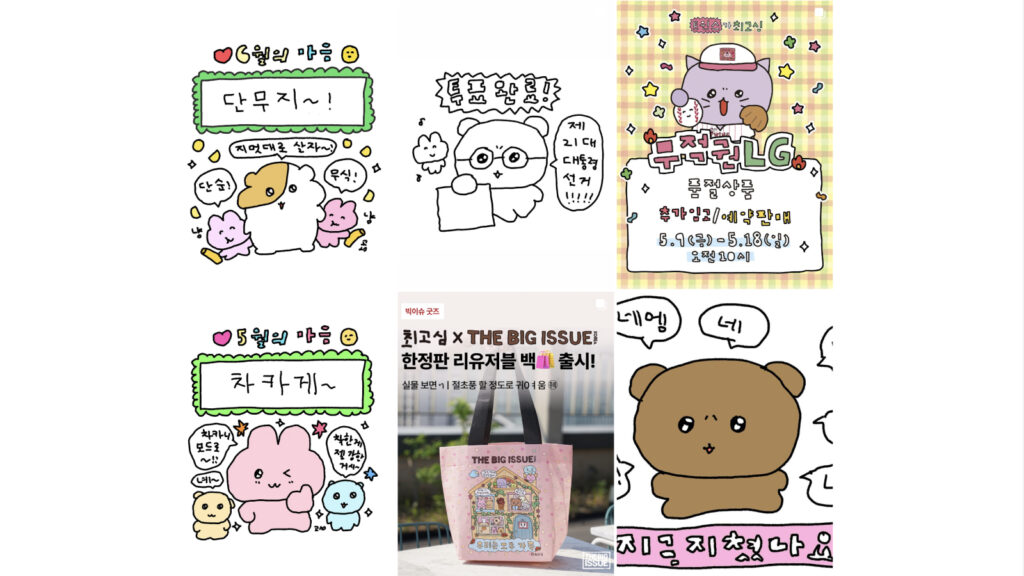 또한, 단순한 그림체와 삐뚤빼뚤한 손글씨, 밝고 쨍한 색감 등은 복잡한 설명 없이도 감정을 즉각적으로 전달할 수 있어 굿즈, 디지털 콘텐츠, 협업 제품 등 다양한 형태에 일관된 톤앤매너를 유지할 수 있는 기반이 되었습니다.
