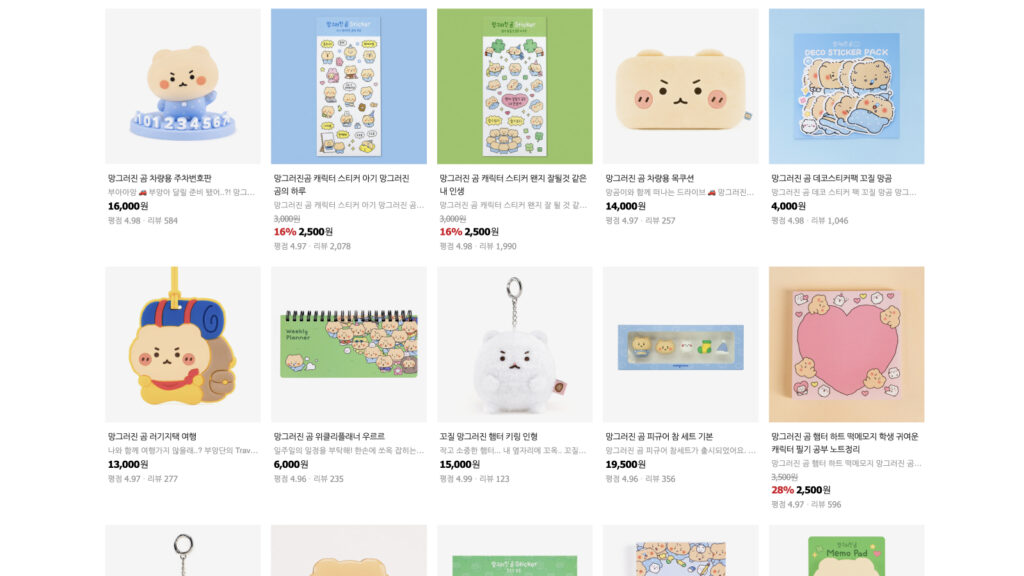 제품 디자인에서도 망곰 특유의 하찮고 ‘망그러진’ 느낌을 놓치지 않습니다. 예를 들어, 인형의 경우 삐뚤빼뚤한 눈 코 입의 배치나 어딘가 어설픈 포즈를 그대로 살려 캐릭터의 매력을 극대화합니다. 이는 완벽함보다는 유머러스한 불완전함을 선호하는 소비자들의 니즈를 충족시킵니다.