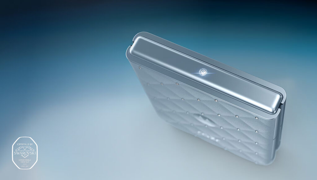가장 눈에 띄는 제품은 크리스털로 장식된 모토로라 레이저입니다. 3D 퀼팅 텍스처와 은은한 빛을 머금은 팬톤 컬러를 바탕으로, 힌지에는 26면 크리스털이, 전체 기기에는 총 35개의 스와로브스키 크리스털이 수작업으로 배치되어 있습니다. 볼륨 버튼에도 크리스털에서 영감을 받은 디자인이 적용되었으며, 제품에는 고급 크로스백 케이스가 포함됐습니다.
