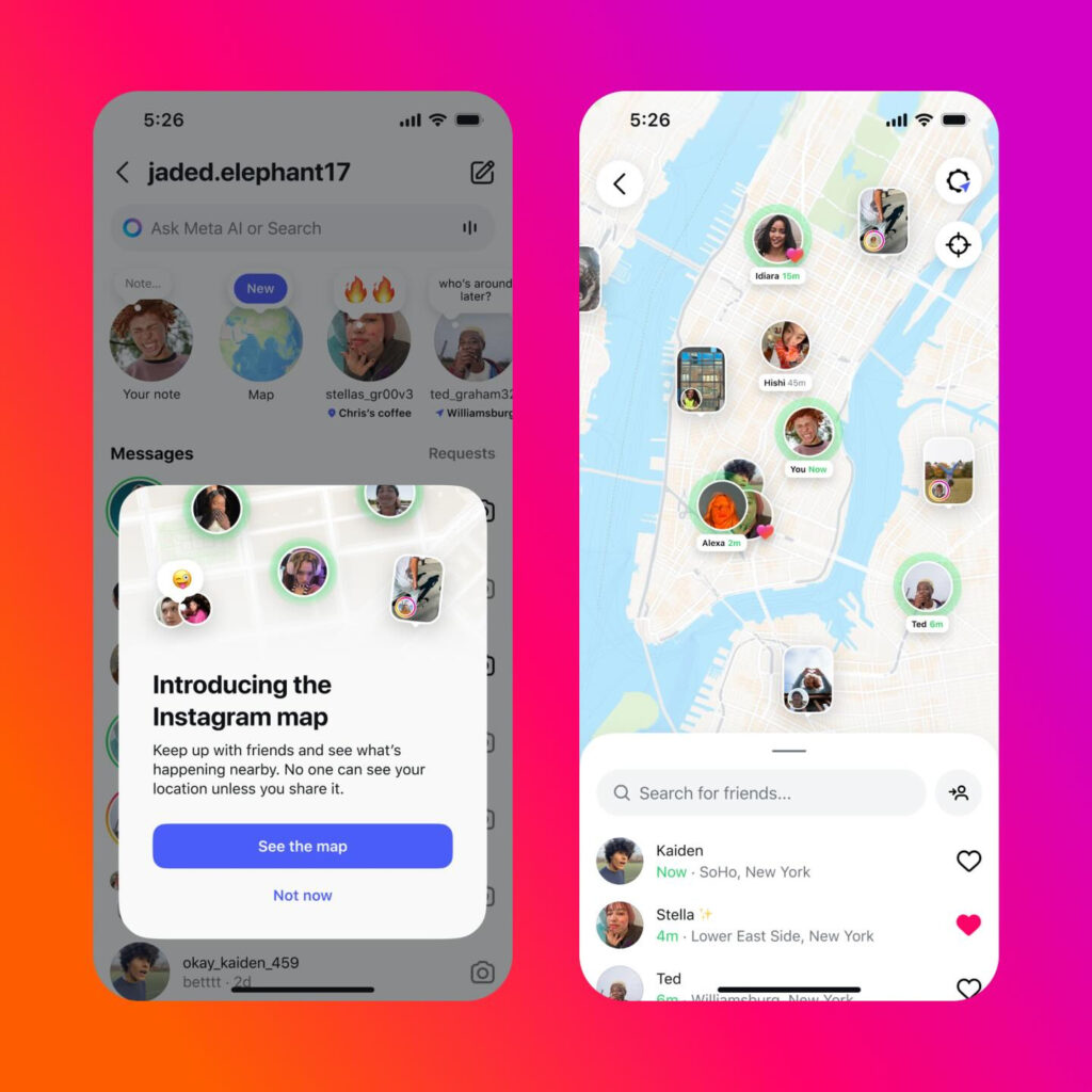 인스타그램이 새로운 기능 ‘인스타그램 맵’을 출시했습니다. 이 기능은 사용자가 최근 활동 위치를 친구와 공유하고 위치 기반 콘텐츠를 탐색할 수 있게 합니다. 미국에서 먼저 적용되며 곧 전 세계로 확대됩니다. 맵은 DM(다이렉트 메시지) 상단에서 접근할 수 있으며 지도 위에 짧은 메시지인 ‘노트’를 남길 수도 있습니다.