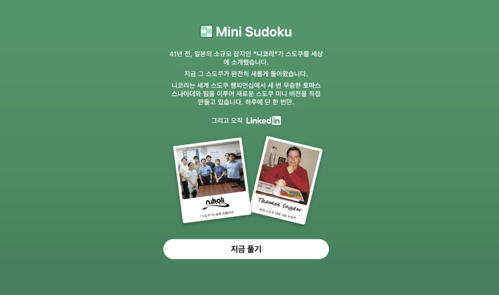 니코리는 1984년 ‘스도쿠’라는 이름과 규칙을 정립하며 일본과 전 세계에 퍼뜨린 퍼즐 전문 출판사입니다. 그러나 해외 확산 과정에서 이름이 빠지는 경우가 많아 일반 대중에는 잘 알려지지 않았습니다. 링크드인 게임팀은 9개월 전 일본 도쿄에서 니코리와 직접 만나 협업을 논의했고, 이를 계기로 현대적 감각을 더한 스도쿠 재탄생 프로젝트가 시작됐습니다.