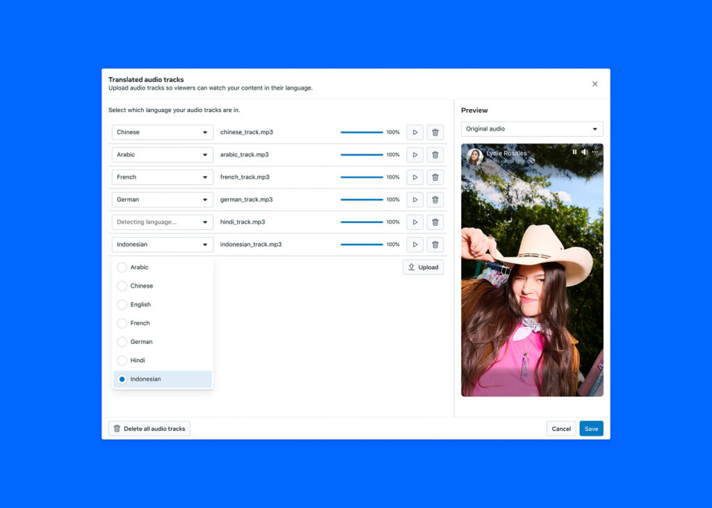 흥미로운 점은 페이스북 페이지 관리자가 직접 제작한 더빙 오디오를 최대 20개까지 하나의 릴에 업로드할 수 있다는 점입니다. 이를 통해 크리에이터는 AI 자동 번역뿐 아니라 자신이 준비한 다국어 오디오를 활용해 더 다양한 언어권 시청자와 소통할 수 있습니다.