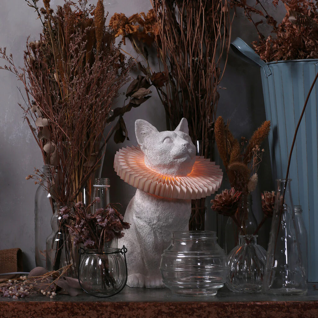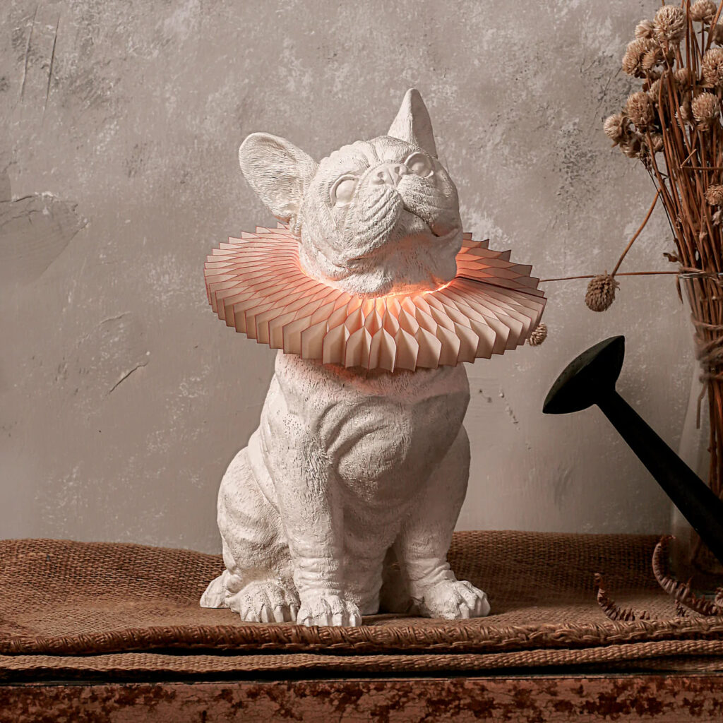 대표작인 ‘Playful Dog X Lamp’는 반짝이는 공을 입에 물고 노는 강아지의 모습을 형상화했습니다. 공은 LED 불빛으로 빛나며 반려견의 호기심과 기쁨을 그대로 담아냈습니다. 또한 ‘Cat X Lamp’와 ‘Bulldog X Lamp’는 부끄러움의 상징인 원뿔 모양을 종이 소재의 세련된 목걸이로 변주해 은은하고 따뜻한 빛을 발산합니다. 세 가지 포즈로 구성된 ‘Rabbit X Lamp’는 우아한 주름 장식의 목걸이를 통해 차분하면서도 풍성한 분위기를 연출합니다.