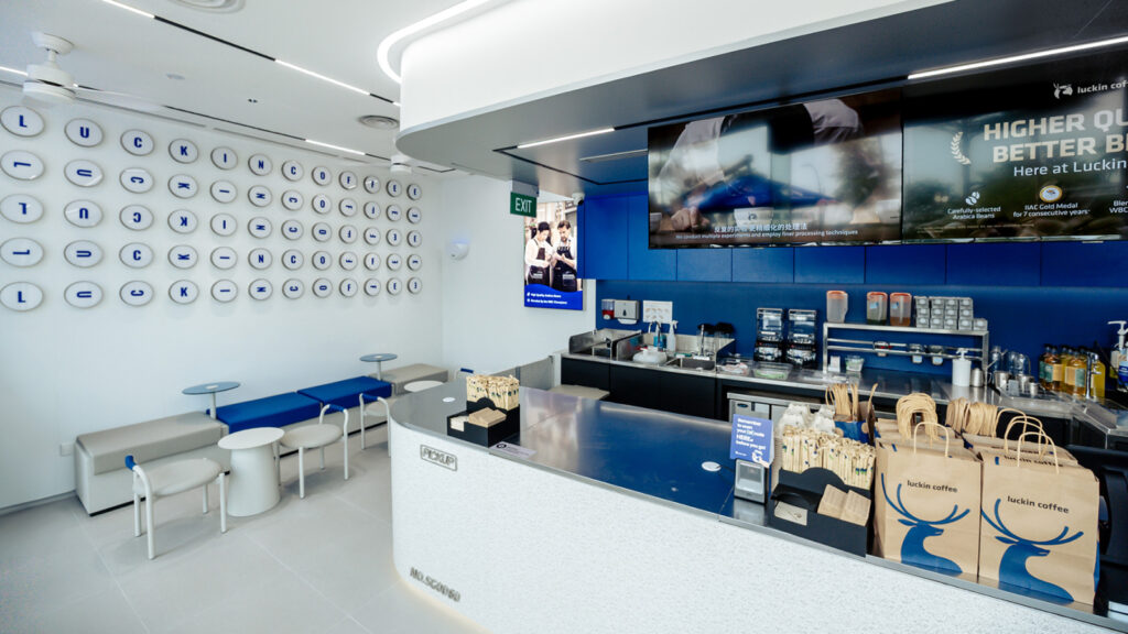 루이싱 커피의 매장 구성은 기존 카페의 “머무는 공간” 개념을 벗어나, 철저히 회전율과 효율성 중심으로 설계되어 있습니다. 대부분의 매장은 10~30㎡ 규모의 소형 매장으로 운영되며, 좌석은 거의 없거나 극소수만 존재하고, 오직 빠른 픽업을 위한 구조로 최적화되어 있습니다.