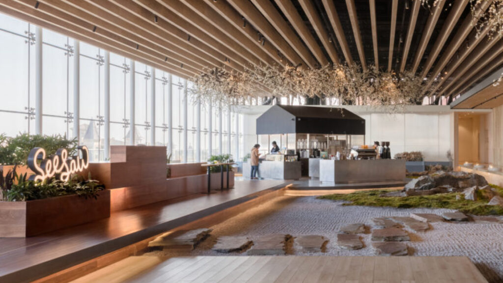 시소 커피의 매장 디자인은 전통적인 카페 공간을 넘어 예술적 감성과 지역 문화가 녹아든 복합적인 경험 공간으로 설계되고 있습니다. 북경 조양 Joycity 몰의 매장은 Nota Architects의 설계를 통해 실내에 자연 풍경을 담아내는 공간으로 구현되었습니다. 목재 데크, 이끼, 바위, 식물, 안개 효과 등 자연적 요소를 적극적으로 도입하여 실내에서도 외부 자연을 걷는 듯한 경험을 제공합니다.