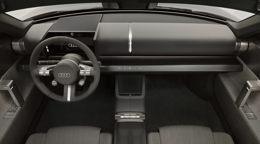실내는 더욱 과감합니다. 대시보드와 도어는 건축적 조형미를 바탕으로 구성되었으며, 물리 버튼은 아노다이징 처리된 알루미늄으로 제작돼 정교한 촉감을 제공합니다. 디지털 요소는 최소화되었습니다. 10.4인치 디스플레이는 필요할 때만 노출되며, 기초적인 주행 정보 외에는 정보 과잉을 피하고 있습니다. 이런 ‘숨은 기술(Shy Tech)’ 접근은 기존 아우디의 복잡한 UI와 차별됩니다.