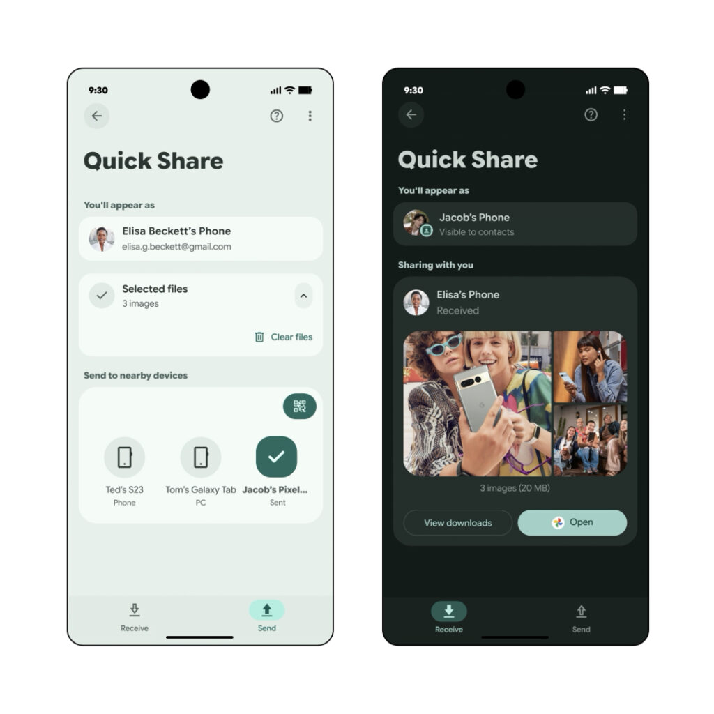 사진과 영상 공유는 퀵 셰어(Quick Share)를 통해 더욱 간편해졌습니다. 보낼 콘텐츠를 미리보기하고 송수신 모드를 쉽게 전환할 수 있으며, 실시간 전송 진행률도 확인할 수 있어 공유 과정에서의 불편함이 크게 줄어들었습니다.