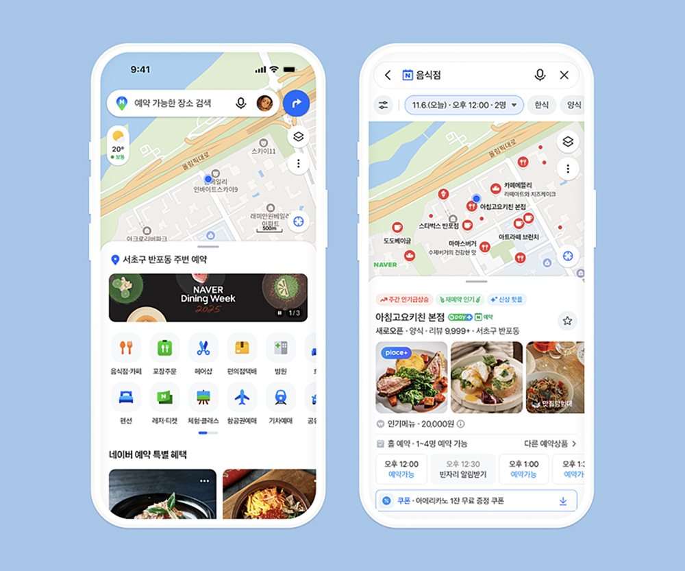 서비스 구조도 크게 바뀌었습니다. 하단 탭은 ‘발견-예약-대중교통-내비게이션-저장’으로 재정비됐으며, MY 탭은 상단으로 이동해 개인의 방문 이력과 예약, 리뷰를 한눈에 관리할 수 있게 됐습니다. 지도 내에서 음식점 예약을 마치면 일정이 자동으로 연동되고, 혜택과 알림까지 통합됩니다.
