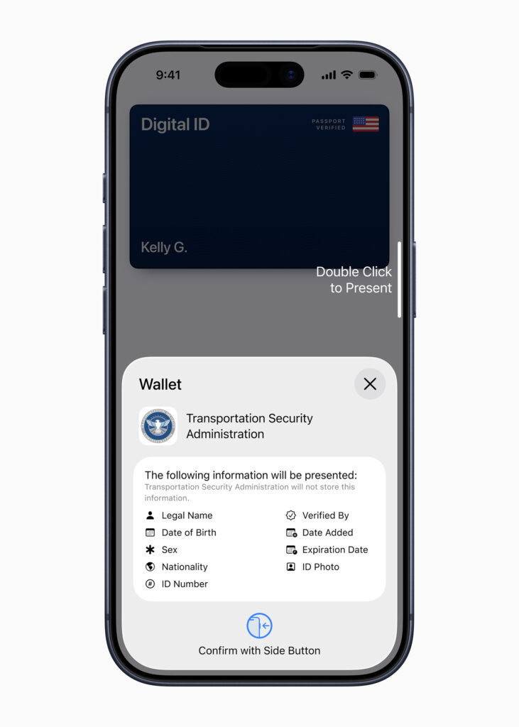 사용 시에는 측면 버튼을 두 번 누르면 디지털 ID가 나타납니다. 인증 요청 항목을 확인한 뒤 얼굴인식이나 지문인식으로 승인하면 필요한 정보만 제시됩니다. 기기를 직원에게 건네거나 잠금을 해제할 필요가 없으며 소유자만 제시할 수 있다는 점이 강조됩니다.