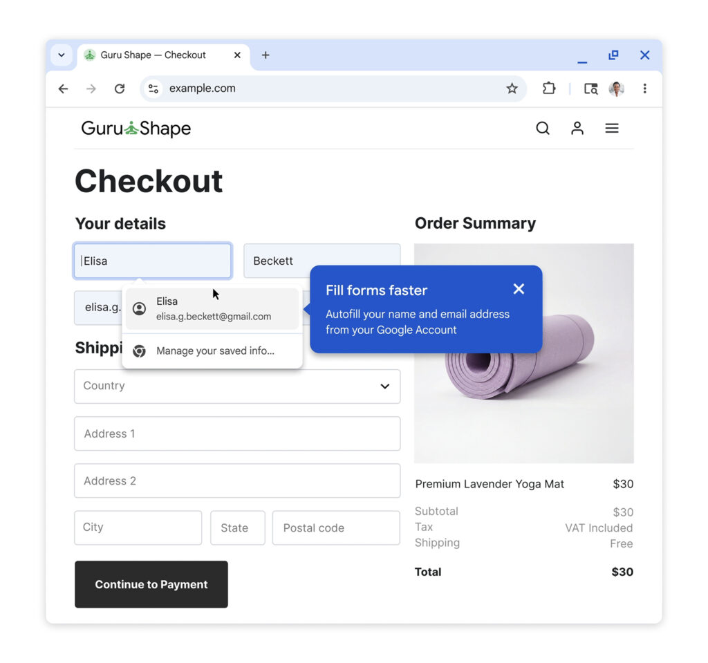 첫 번째 변화는 구글 계정과의 연동 강화를 통한 개인정보 입력 단축입니다. 로그인 상태라면 이름과 이메일 주소를 입력해야 하는 상황에서 계정 정보를 즉시 불러옵니다. 온라인 쇼핑이나 서비스 예약 시 저장된 집 주소와 회사 주소도 계정에서 즉시 호출됩니다. 새로운 웹사이트를 처음 이용하는 상황에서도 주소 입력 과정이 자연스럽게 이어지고 전체 사용자 경험이 매끄러워집니다.