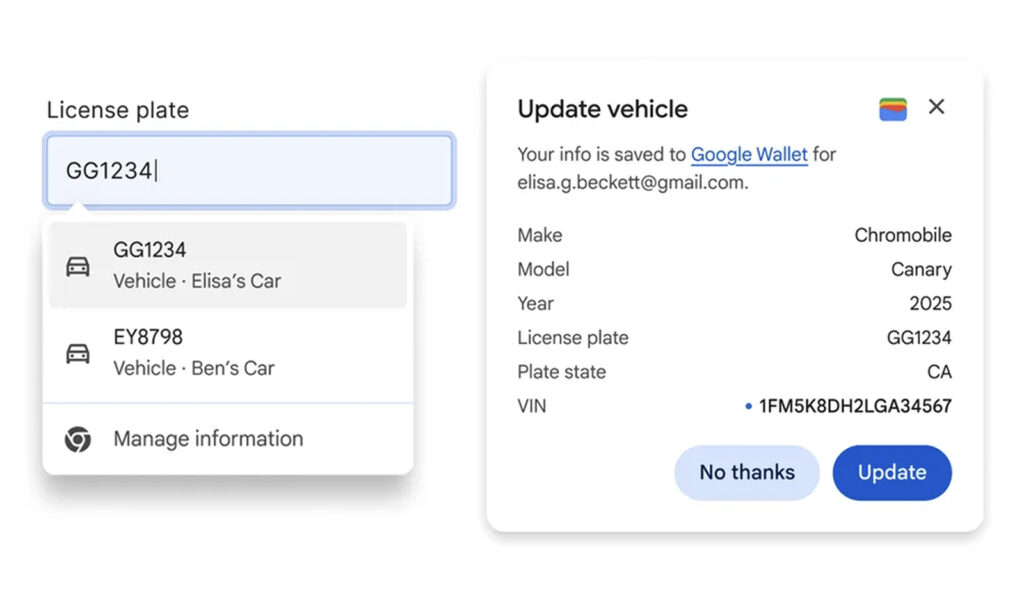 두 번째 변화는 구글 월렛과의 통합입니다. 사용자들은 이제 적립 카드 번호나 항공편 정보 그리고 차량 정보를 기억하거나 직접 찾아볼 필요가 없습니다. 크롬이 월렛에 저장된 정보를 자동으로 인식하고 필요한 입력란에 즉시 채워 넣습니다. 공항에서 렌터카를 예약하며 항공편 정보를 입력해야 하는 상황을 예로 들면 크롬이 예약 정보를 감지해 확인 번호와 날짜를 자동으로 제시합니다. 렌터카 예약뿐 아니라 보험 견적 조회처럼 차량 정보를 요구하는 상황에서도 월렛에 저장된 차량 정보를 자동으로 불러옵니다. 스마트 입력 기능을 이용하려면 크롬 설정에서 향상된 자동완성을 활성화하면 됩니다.