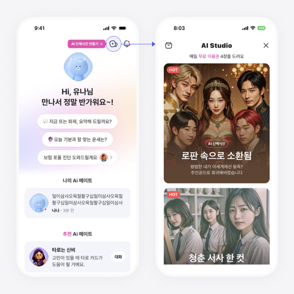 AI 스튜디오 기능도 새롭게 추가됐습니다. 최대 6명까지 참여 가능한 단체 사진 생성 기능으로 로맨스 판타지 청춘 서사 키즈모델 Y2K 스타일 크리스마스 등 9가지 콘셉트를 지원합니다. 이용자는 하루 4장의 이미지를 무료로 생성할 수 있어 지인들과 함께 즐기는 콘텐츠 경험을 제공합니다.