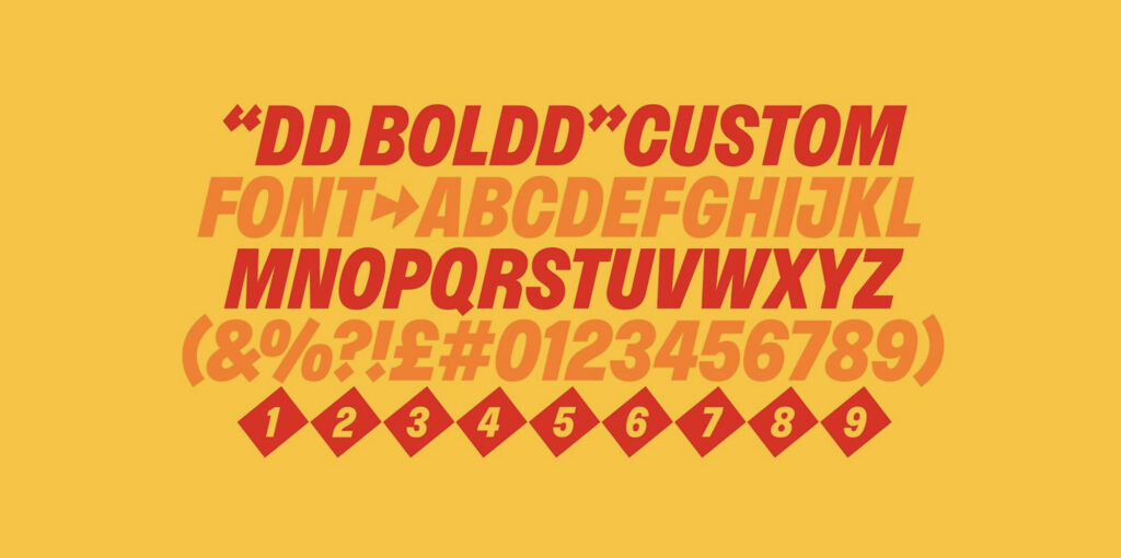 비주얼의 핵심은 절제입니다. 검정에 더해 노랑과 빨강만 두고 두 색의 겹침에서 생기는 오렌지를 활용했습니다. 서체도 하나로 고정했습니다. 글래스고의 폴리타입 소속 루이스 맥도널드가 제작한 맞춤 서체 DD 볼드가 전 접점에 쓰입니다. 1960년대 라벨에서 가져온 기울어진 대문자 인상과 더블 D 심볼도 유지했습니다. 마스코트 리틀 맨은 새로 그려지고 애니메이션으로 움직이게 만들었습니다.