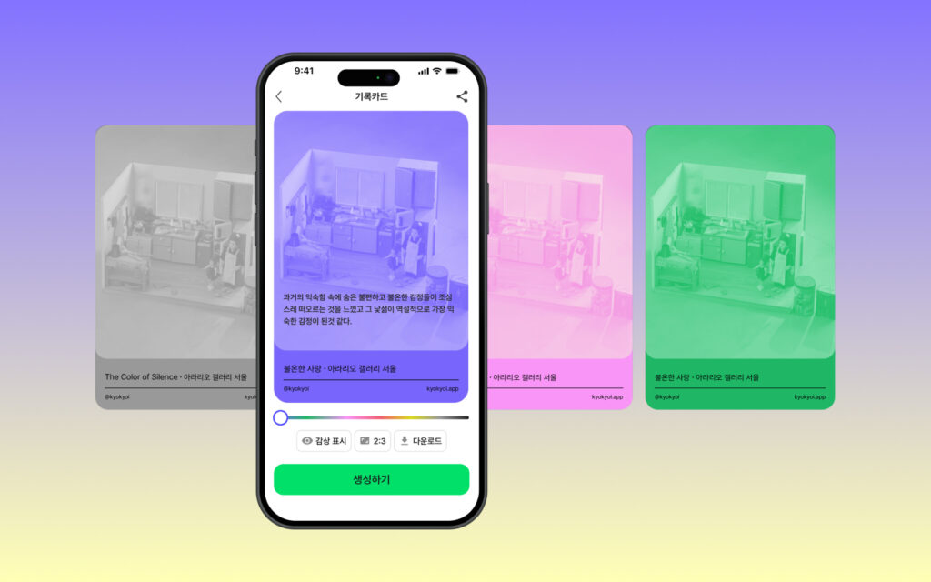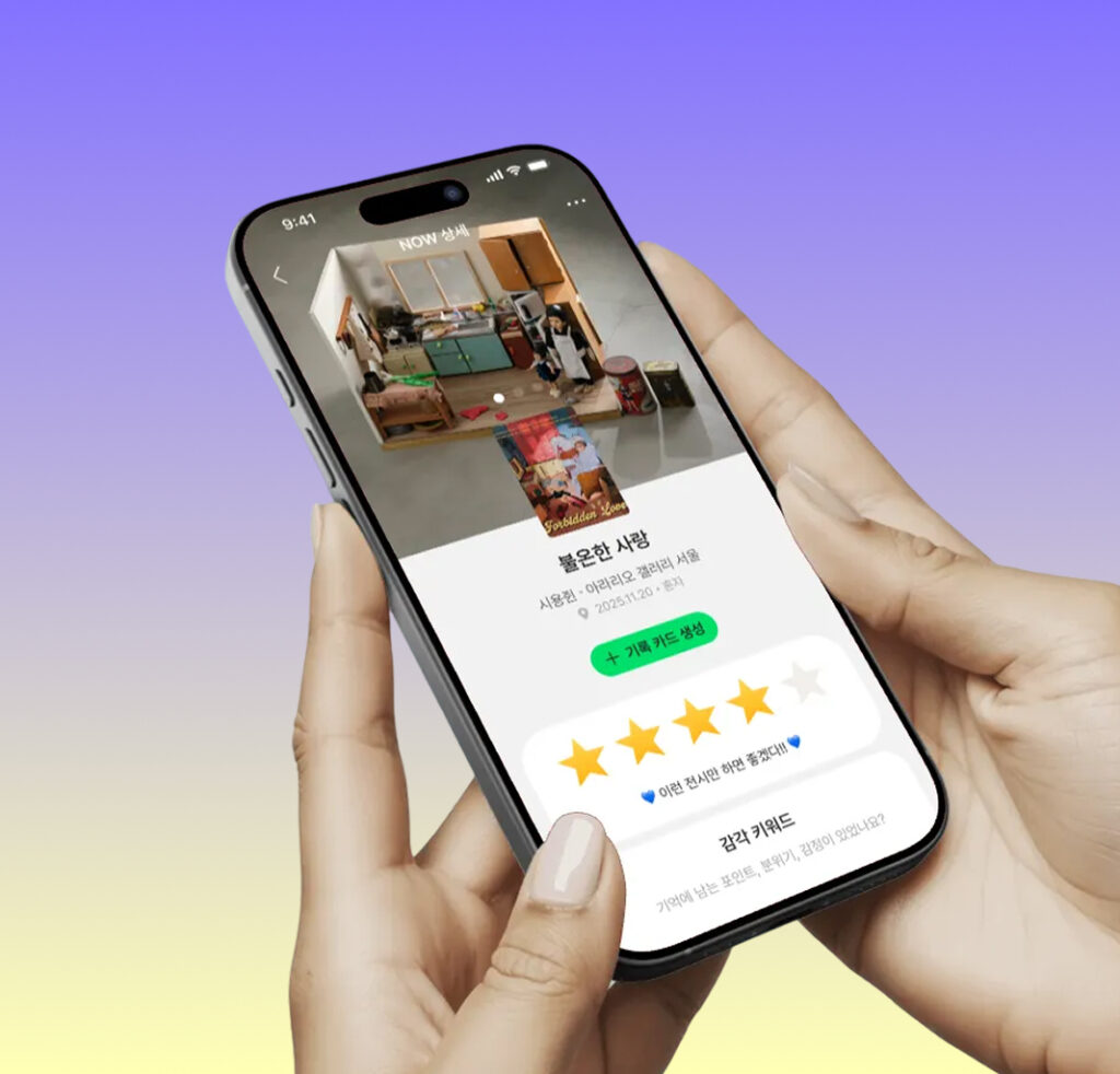 내가 남긴 전시 기록은 기록 카드로 만들 수 있습니다. 내가 찍은 사진과 짧은 기록을 바탕으로 하나의 톤과 색으로 정리된 카드가 완성됩니다. 개인의 감상이 디자인된 결과물로 바뀌는 경험입니다.