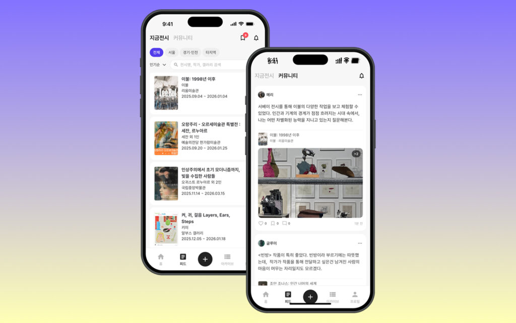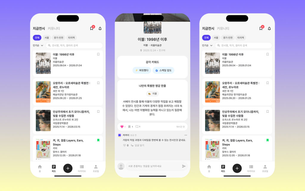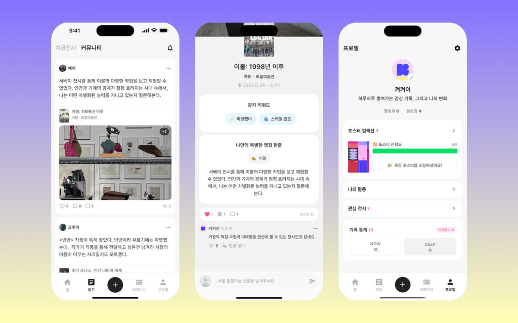 켜켜이 안에는 예술을 좋아하는 사람들과 영감을 나누는 커뮤니티가 있습니다. 같은 전시를 보고 나와 비슷한 생각을 한 사람의 기록을 읽으면 자연스럽게 공감이 생깁니다. 반대로 전혀 다른 관점의 기록을 만나면 내 사고가 확장되는 경험도 합니다. 이런 흐름 속에서 내가 관심을 가질 만한 새로운 전시를 발견하기도 하고 마음에 드는 사람은 팔로우하며 지속적으로 소식을 따라갈 수도 있습니다. 기록과 공유가 한 앱 안에서 이어지는 것도 편리합니다.