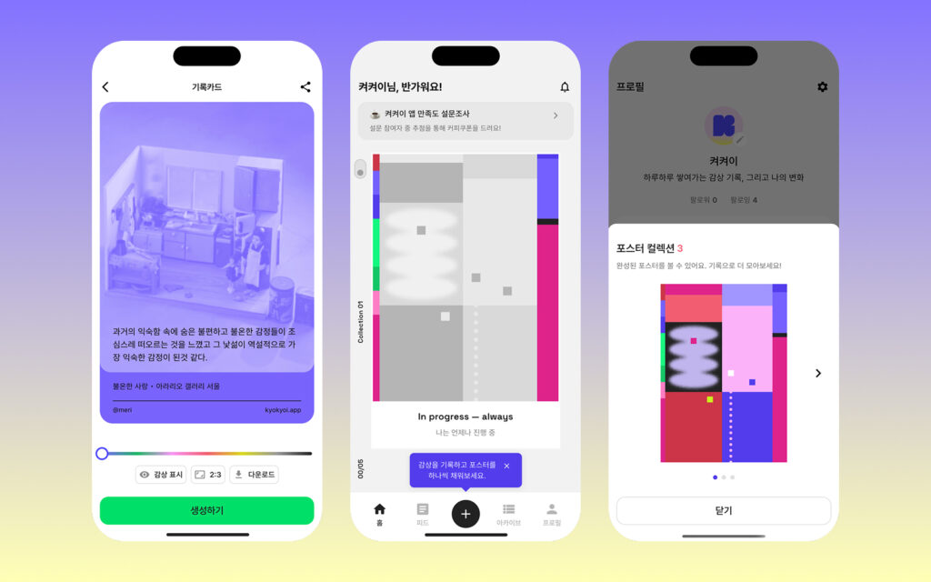 여기에 독특한 챌린지 기능도 제공합니다. 추상적인 경험을 예쁜 결과물로 바꾸는 방식은 이미 우리 주변에 많습니다. 아티스트 포토 카드나 영화 관람권처럼 경험을 작은 형태로 남기면 그 순간을 더 선명하게 추억할 수 있습니다. 켜켜이는 이 감각을 기록 카드와 포스터로 가져왔습니다.