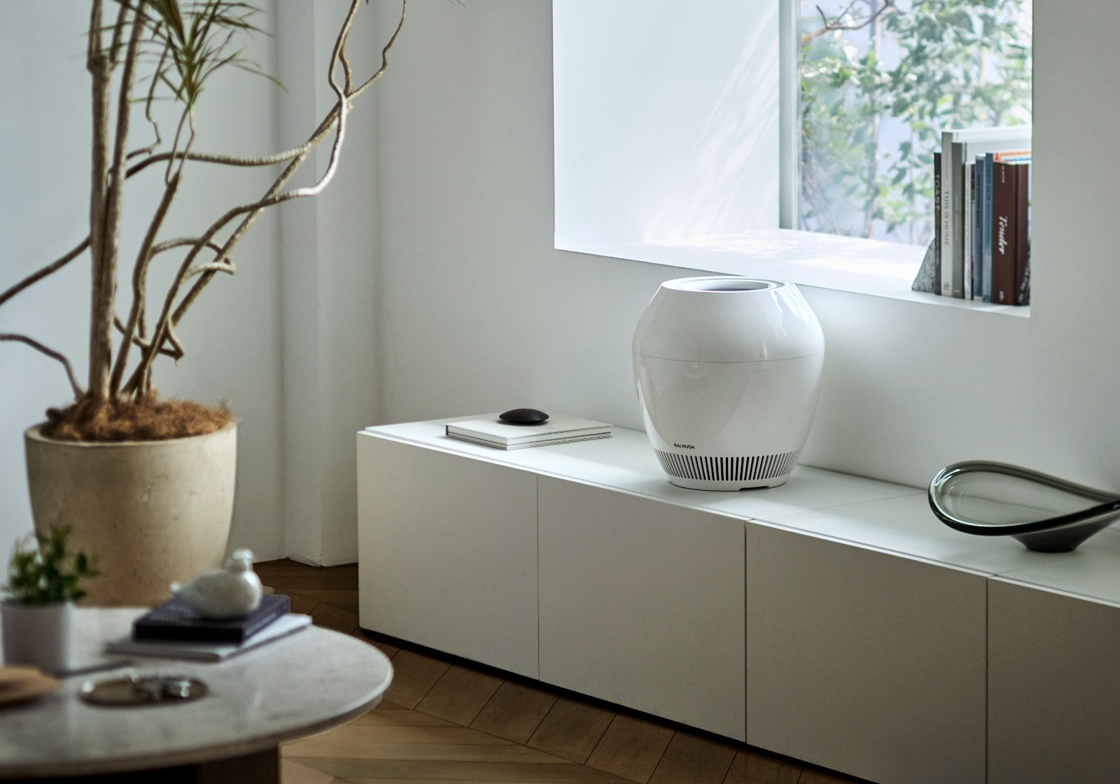 발뮤다의 2025년형 레인 신모델 AHM01 시리즈입니다. 레인은 항아리와 화기에서 착안한 조형과 상부 직접 급수 방식의 기화식 가습기라는 정체성을 유지해온 제품입니다. 이번 신모델은 기존 콘셉트를 유지하면서 디스플레이 연출 앱 연동 관리 편의 전반을 대폭 강화한 것이 특징입니다.