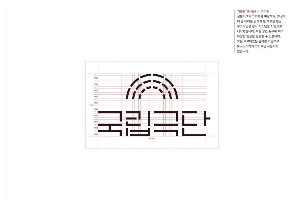 이번 리뉴얼에서 CI 디자인은 스튜디오 신신이 맡았고 전용서체 디자인은 양장점이 담당했습니다. 두 팀은 기존에 텍스트 기반으로 작업했던 심볼의 기하학적 세부를 눈치채기 어려울 정도로 미세 조정한 뒤 그 결과를 체계화해 그리드를 만들었습니다. 이후 이 그리드를 기준으로 국립극단 국문 워드마크와 영문 워드마크를 새로 설계해 심볼과 로고타입의 결을 정교하게 맞췄습니다.