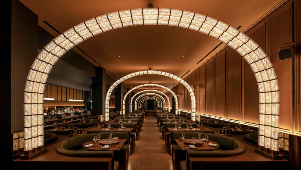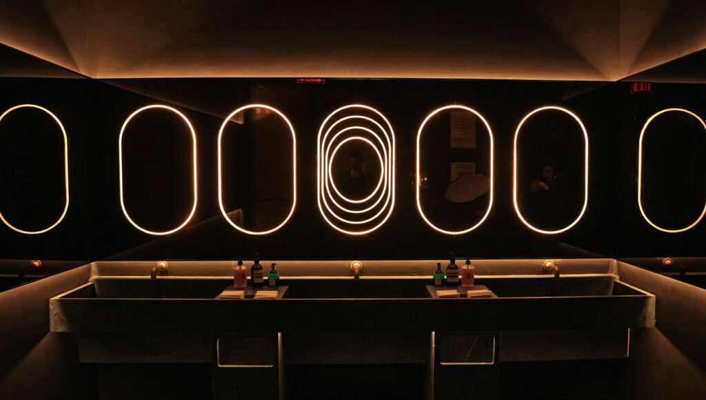 인테리어는 록웰 그룹이 맡아 어둡고 무드 있는 공간에 따뜻한 조명으로 몰입감을 만들었습니다. 유리 아치와 무한 거울을 활용해 성당의 신랑처럼 긴 깊이를 강조했고 후면에는 비밀 노래방 공간 고고싱을 숨겨 경험을 분기했습니다. 로고의 타원형은 거울과 벽등과 좌석 곡선 등 실내 곳곳에 반복됐습니다.