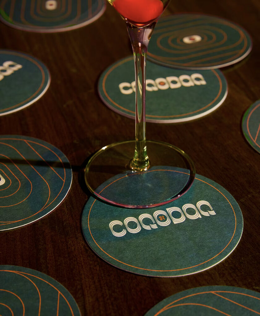 로고타입은 대담하면서도 세련된 커스텀 레터링을 사용했습니다. 핵심 장치는 알파벳 O 안에 한글 닭을 넣은 구조입니다. 코트의 O에 꽃을 담았던 방식과 연결되며 코코닭에서는 알처럼 보이는 원형 구조로 확장했습니다. 이 심볼은 간판과 웹사이트와 공간 그래픽까지 일관되게 적용됐습니다.