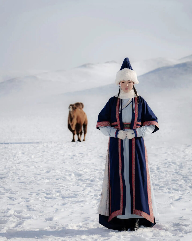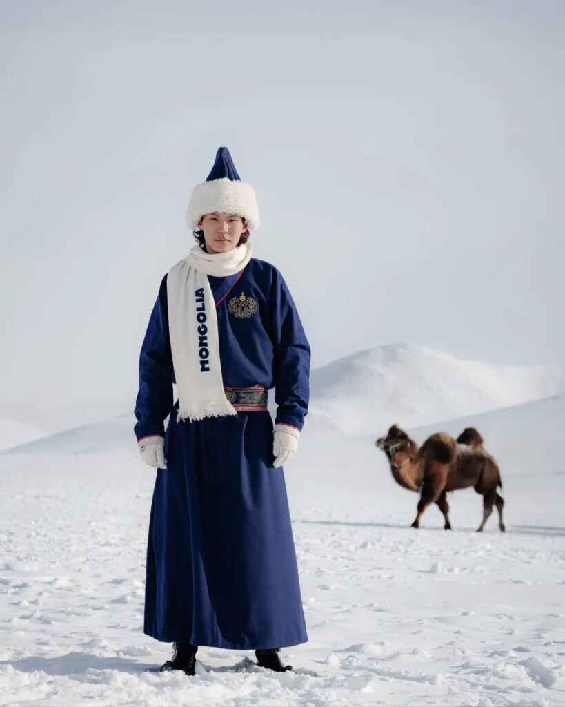 소재는 몽골산 캐시미어가 중심입니다. 의례복에는 실크 트리밍을 더하고 전통 뿔 문양 자수를 얹어 격식을 강화했습니다. 혹독한 겨울을 견뎌온 유목 생활의 재료를 국가 대표 이미지로 끌어올리려는 의도가 읽힙니다.