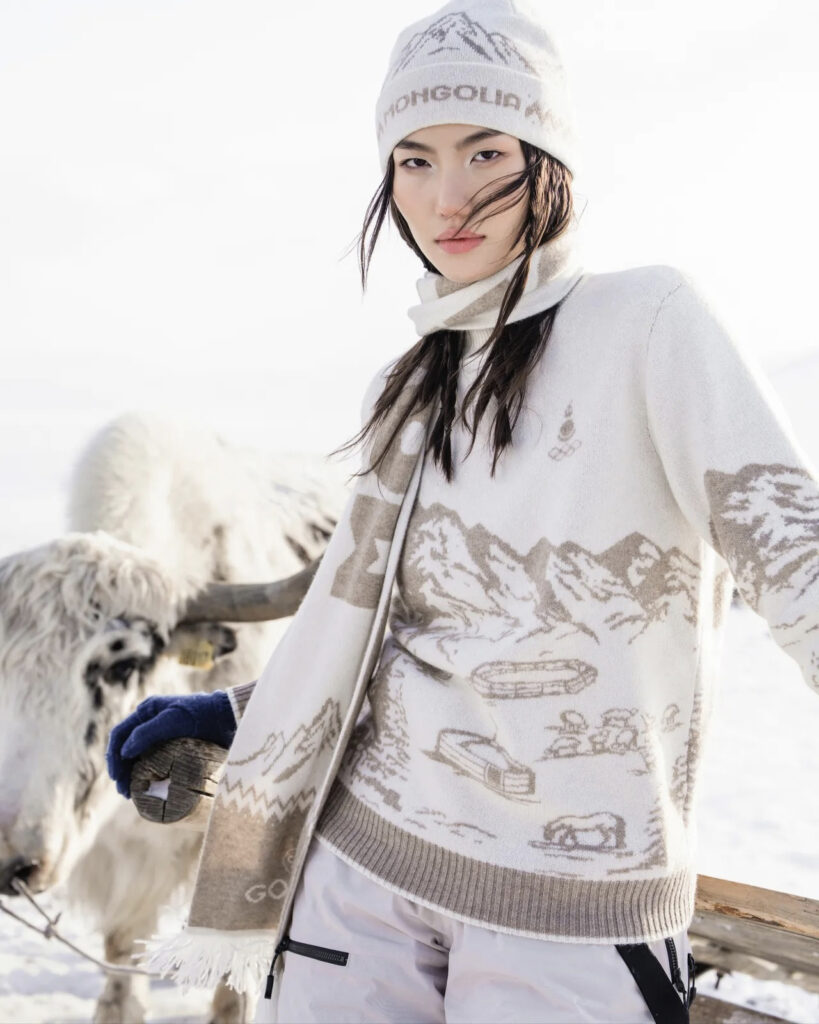 캐주얼 구성도 함께 제시됐습니다. 알파인 스키 스웨터에서 영감을 받은 니트에 게르와 유목 생활을 떠올리게 하는 패턴을 더했다고 전해집니다. 컬렉션 문구로는 겨울을 통과해 온 것을 세계로 가져간다는 메시지가 제시됐습니다.