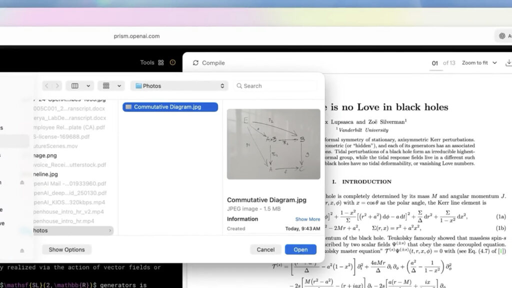 제품 기능은 실무 중심입니다. 사용자는 문서 아래에 붙은 채팅 창에서 초안 작성 도움을 받고 관련 논문을 요약하고 인용을 관리할 수 있습니다. 화이트보드 사진을 넣어 수식이나 다이어그램으로 바꾸는 작업도 지원합니다. 가설이나 증명을 대화로 점검하는 흐름도 포함됩니다. OpenAI는 GPT-5.2를 수학과 과학 문제 해결에 가장 강한 모델로 소개하며 Prism의 핵심 엔진으로 탑재했다고 밝혔습니다.