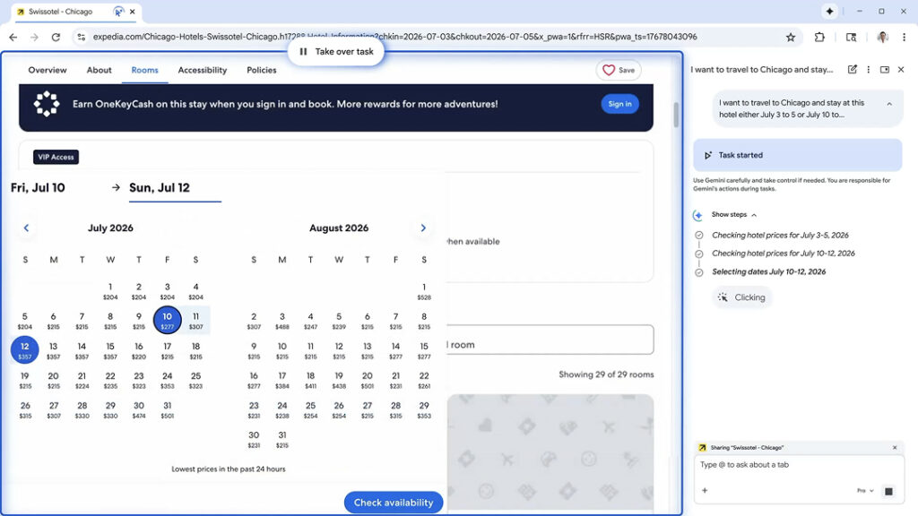 오토 브라우즈는 크롬 우측 사이드바에 탑재된 Gemini를 통해 작동합니다. 사용자는 별도의 탭 전환 없이 현재 보고 있는 웹페이지와 상호작용하며 명령을 내릴 수 있습니다. 제미나이는 페이지를 클릭하고 스크롤하며 텍스트를 입력하는 등 실제 사용자의 행동을 그대로 재현해 작업을 수행합니다. 명령이 입력되면 제미나이는 작업이 시작됐음을 알리고 단계별로 탐색을 진행합니다.