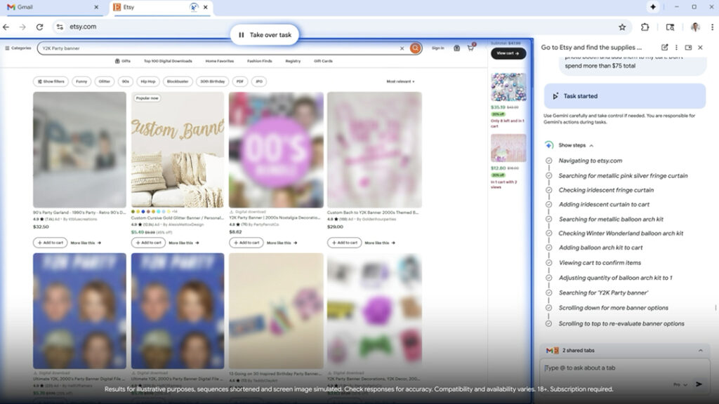 구글이 제시한 사례에 따르면 사용자가 파티 용품 구매를 요청하면 제미나이는 지정된 쇼핑 사이트에 접속해 예산과 테마에 맞는 상품을 검색하고 장바구니에 담은 뒤 결제 직전 단계까지 마무리합니다. 할인 코드 검색도 자동으로 수행하며 사용자가 허용할 경우 구글 비밀번호 관리자를 활용해 로그인 과정까지 처리합니다. 작업 도중 사용자가 직접 개입할 수 있도록 상단에는 테이크 오버 태스크 버튼이 항상 표시됩니다.