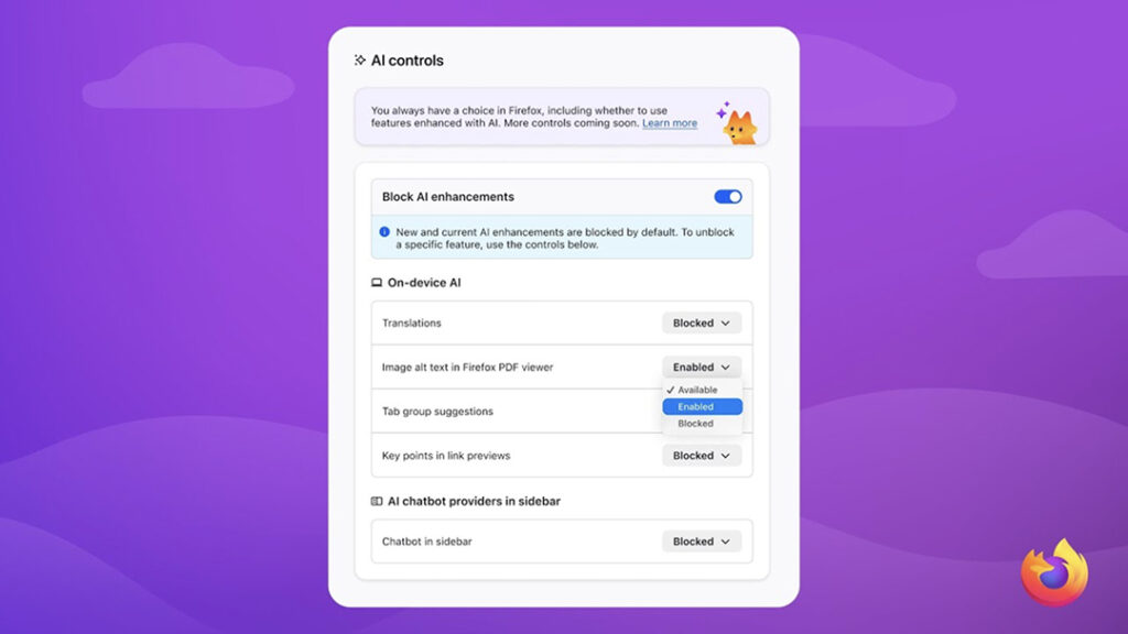 핵심은 ‘AI 향상 기능 차단’ 토글입니다. 이를 켜면 기존 기능과 예정 기능에 대한 팝업 안내나 사용 권유 알림이 나타나지 않도록 하는 것이 목표입니다. 모질라는 업데이트 이후에도 이용자가 선택한 AI 설정이 유지되며 언제든 다시 바꿀 수 있다고 설명했습니다.