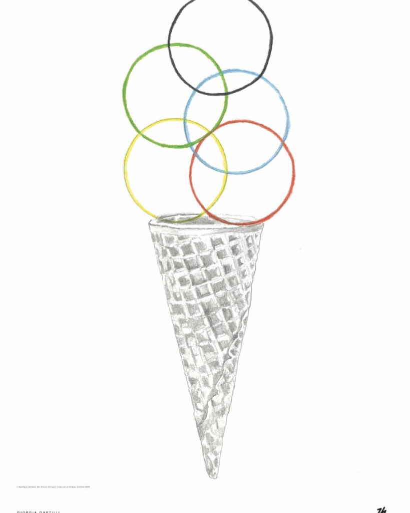 가장 널리 회자된 이미지 중 하나는 작가 조르자 가르질리의 작품 2026입니다. 오륜을 다섯 가지 맛의 젤라토처럼 콘 위에 겹쳐 쌓아 올림픽의 상징을 한 입의 즐거움으로 바꿨습니다. 토치와 아이스크림을 겹쳐 보이게 하는 발상은 축제의 따뜻함을 겨울 스포츠의 차가운 풍경 위에 얹습니다. 스포츠의 격렬함을 설명하기보다 관객의 감각을 먼저 자극하는 방식입니다.