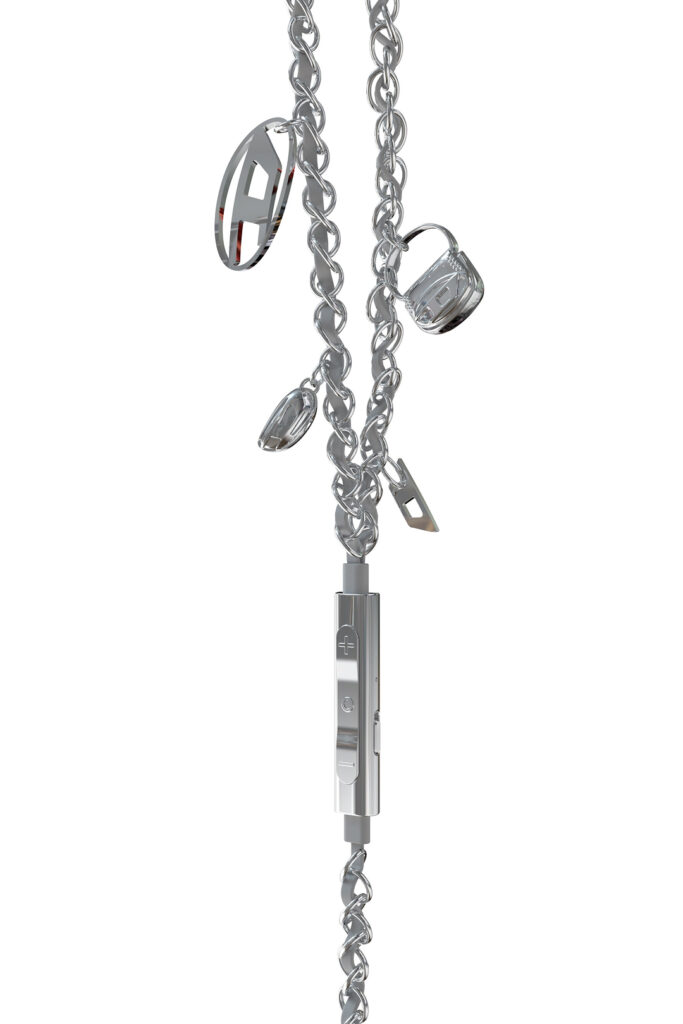 제품은 디젤 특유의 산업적 미감을 강조합니다. 은색 톤 마감에 금속 장식이 더해졌습니다. 더버지는 케이블에 체인 형태의 요소와 참 장식이 결합됐다고 전했습니다. 장식 소재는 알루미늄과 아연 합금으로 소개됐습니다. 패션 소품처럼 보이도록 설계된 지점이 핵심입니다.  제품 상세 이미지를 기준으로 USB C 연결로 인라인 리모컨과 마이크가 포함되며 음량과 재생 제어와 마이크 음소거 스위치도 확인됩니다.