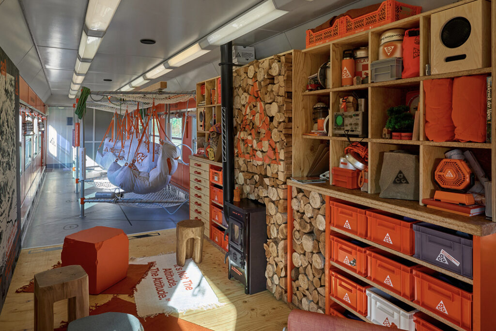 회복 공간에는 여러 형태의 좌석과 난로 연출이 배치됐습니다. 쌍안경과 수납장과 ACG 소품도 채워 넣어 베이스캠프 같은 인상을 만들었습니다. 장비 칸은 테스트와 보관을 강조했고 열차를 축소한 모형 세트도 설치해 프로젝트의 상징성을 반복했습니다.