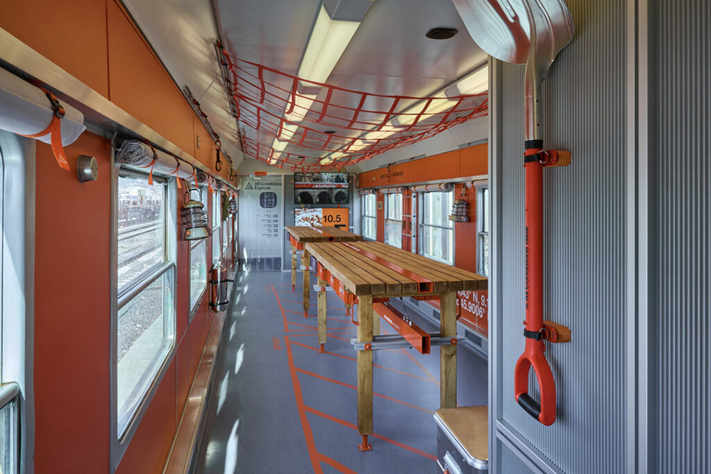 열차 외관은 ACG를 상징하는 주황색으로 통일됐습니다. 내부는 좌석 칸과 카페 칸과 장비 칸과 회복 공간 등으로 나뉘었습니다. 좌석 칸은 주황색 패브릭과 로고가 들어간 헤드레스트로 꾸몄습니다. 카페 칸은 산악 산장 분위기를 참고해 커피 제공과 기념품 판매 기능을 함께 넣었습니다.