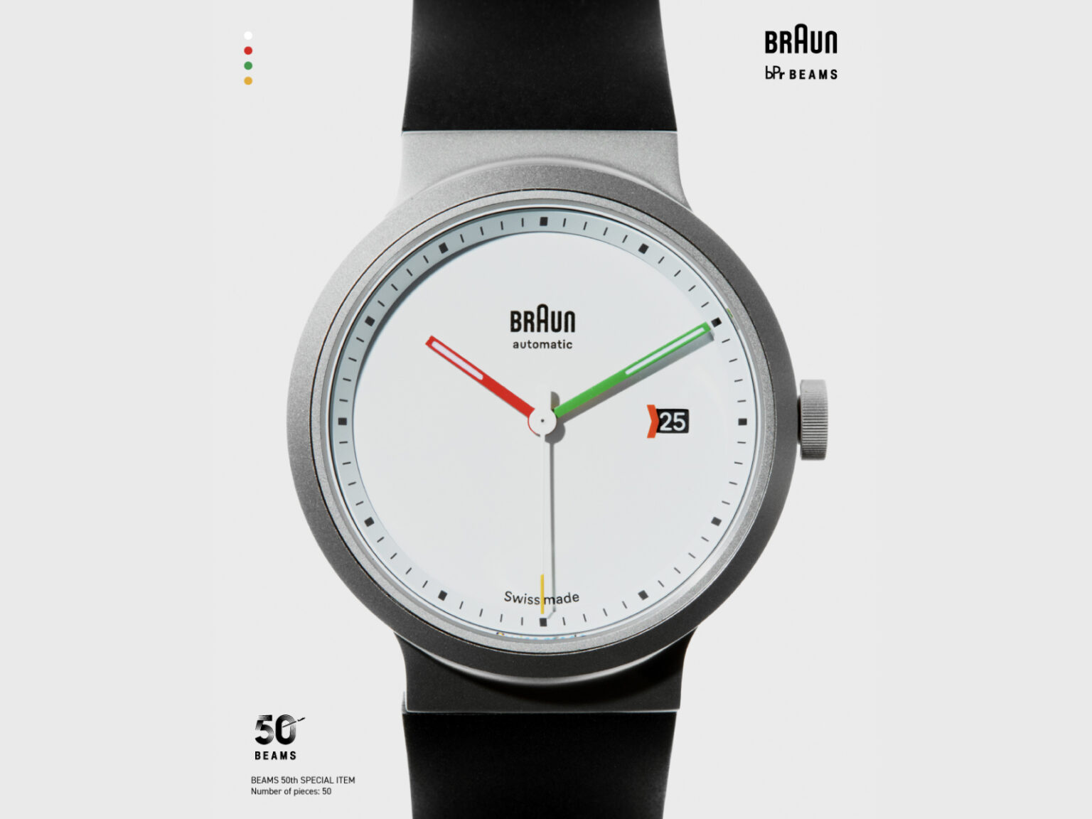 BN0279도 흥미롭습니다. 빔스는 이 모델을 브라운이 처음으로 스위스제 기계식 무브먼트를 채택한 시계 라인이라고 설명했습니다. 기본적으로 브라운의 단정한 시계 디자인을 바탕에 두고 초침과 인덱스에 컬러 포인트를 넣어 한정 협업의 성격을 드러냈습니다. 브라운 공식 스토어에 따르면 BN0279는 40mm 케이스와 사파이어 글라스 그리고 러버 스트랩을 갖춘 스위스 메이드 오토매틱 워치입니다.
