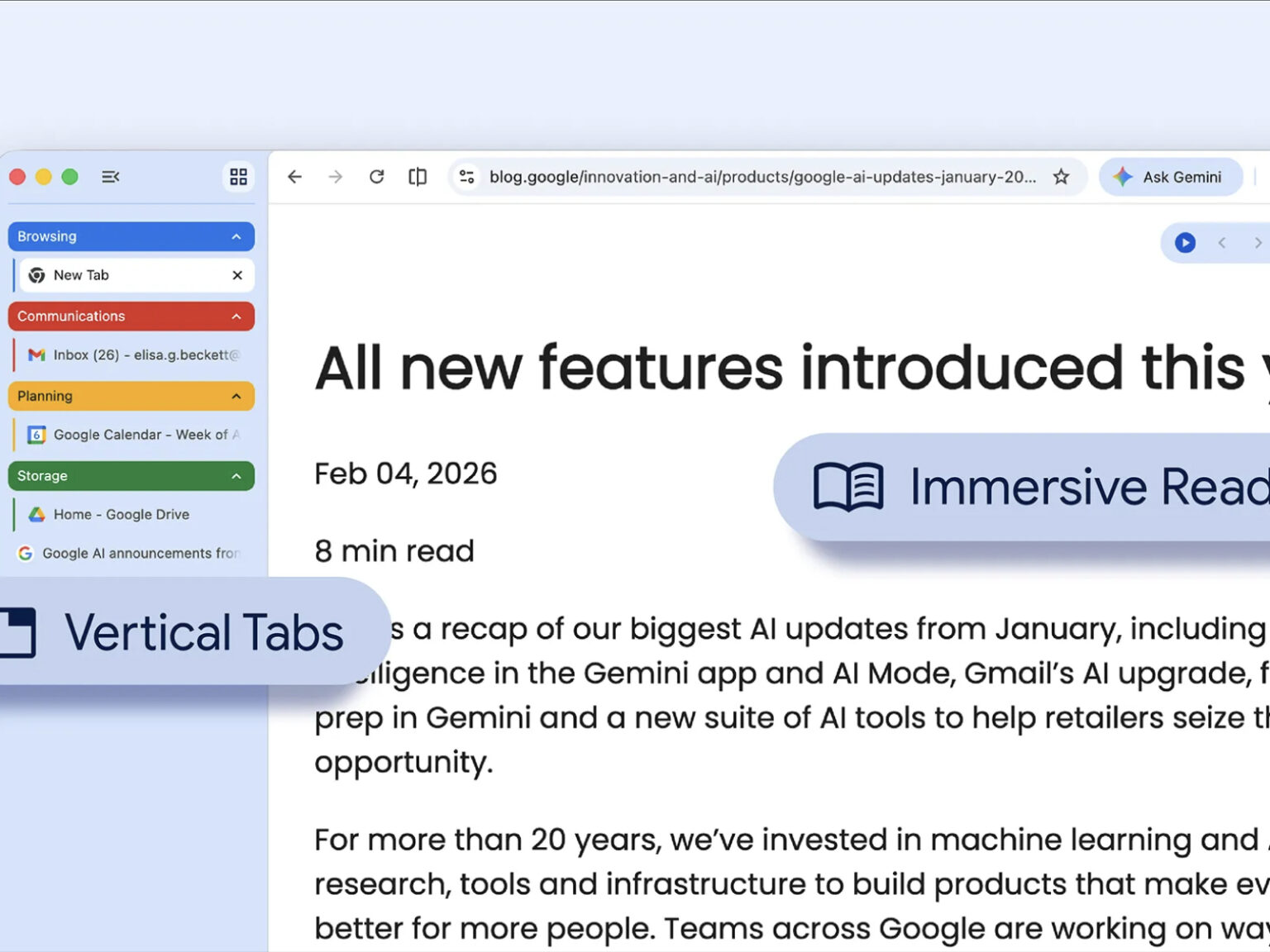 구글이 크롬에 생산성을 높이는 두 가지 새 기능을 도입하기 시작했습니다. 4월 7일 공개된 이번 업데이트의 핵심은 세로 탭과 몰입형 읽기 모드입니다. 구글은 이 기능들이 브라우저 화면을 더 정리된 상태로 유지하고 사용자가 많은 탭과 긴 글을 더 효율적으로 다룰 수 있게 돕는다고 설명했습니다. 공식 안내에 따르면 기능은 순차적으로 배포되고 있습니다.