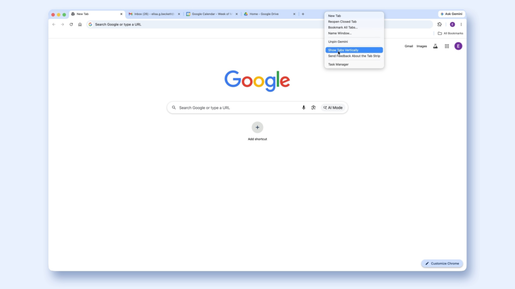 가장 눈에 띄는 변화는 세로 탭입니다. 이제 사용자는 크롬 창에서 마우스 오른쪽 버튼을 눌러 ‘Show Tabs Vertically’를 선택하면 탭을 화면 상단이 아니라 왼쪽이나 옆 영역에 세로로 배치할 수 있습니다. 이 방식은 탭 제목을 더 길게 보여줄 수 있다는 점이 강점입니다. 탭이 두 자릿수 이상으로 늘어나도 어떤 페이지가 열려 있는지 한눈에 확인하기 쉬워지고 탭 그룹 관리도 더 수월해집니다. 여러 작업을 동시에 처리하는 사용자에게는 꽤 반가운 변화입니다.